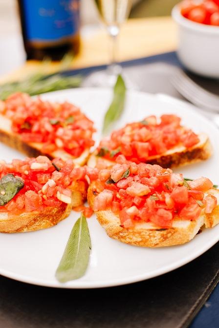 Pão italiano tostado guarnecido com tomates temperados com alho, azeite e manjericão. (4 fatias)