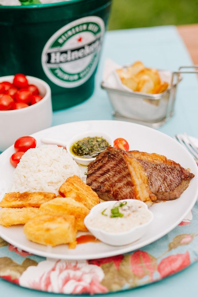Acompanha arroz branco, mandioca frita e chimichurri Grilled Beef (picanha) with rice and fried cassava