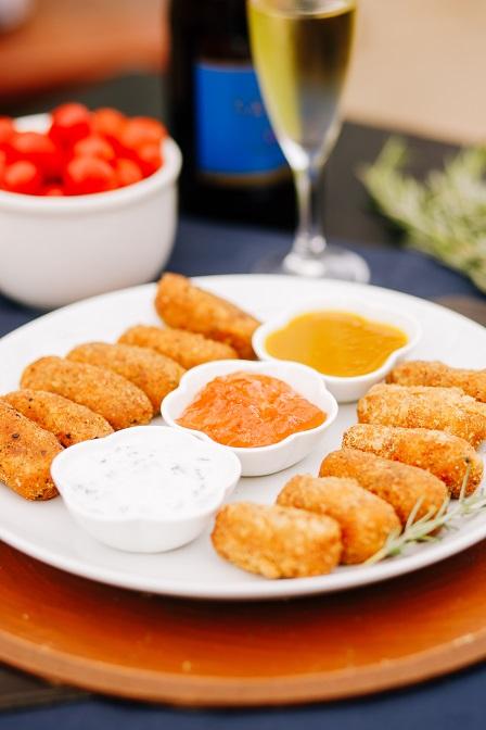 12 unidades de croquete de camarão servido com molhinhos variados