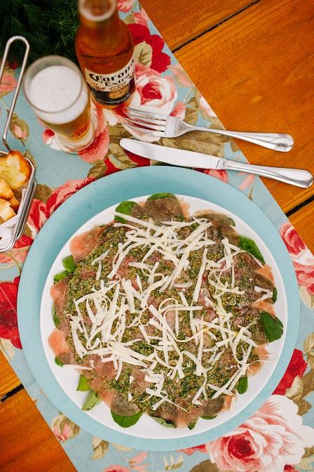 Finas camadas de carpaccio de carne sob cama de rúcula, regado com molho de alcaparras, mostarda e parmesão