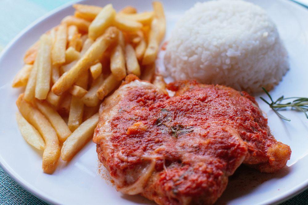 Filé de frango empanado, coberto com molho de tomate caseiro e gratinado com queijo mussarela, guarnecido com arroz e fritas. Chicken fried steak with homemade tomato sauce, cheese, rice and french fries