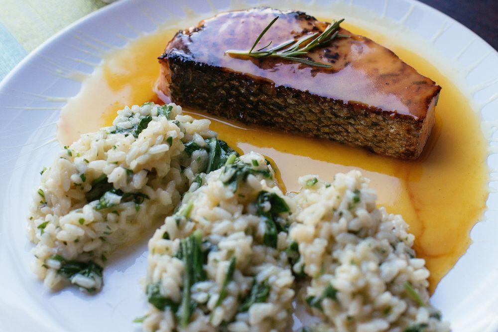 Acompanha risoto de rúcula Grilled salmon with orange sauce, and arugula risoto