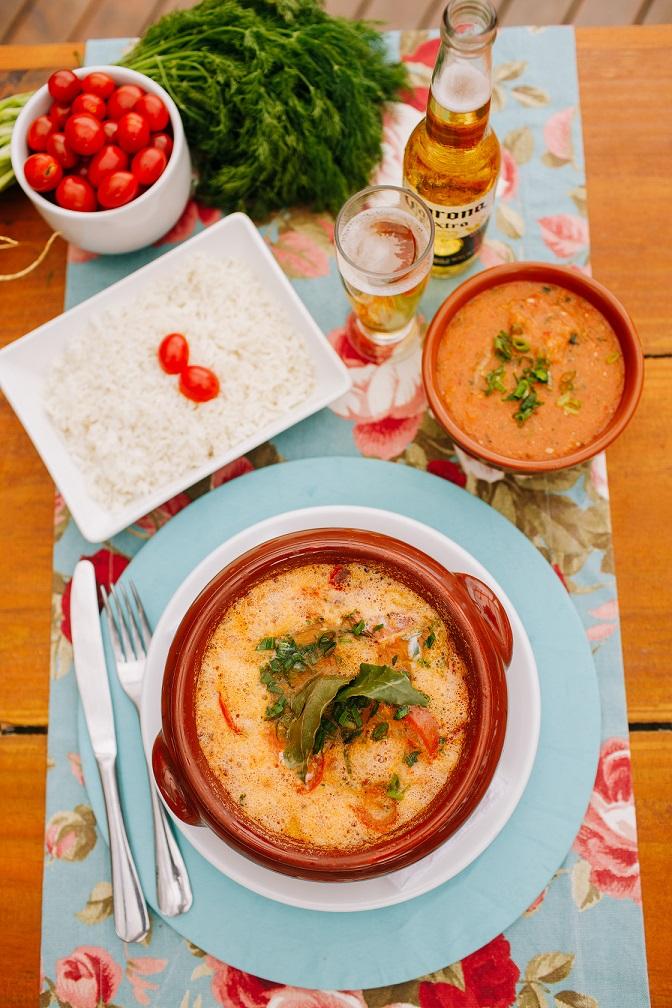 Peixe dourada em postas, com frutos do mar, leite de coco, pimentões e molho de tomate Fish and sea food soup with coconut cream, green, yelow and red pepper (Dish for 2 people)