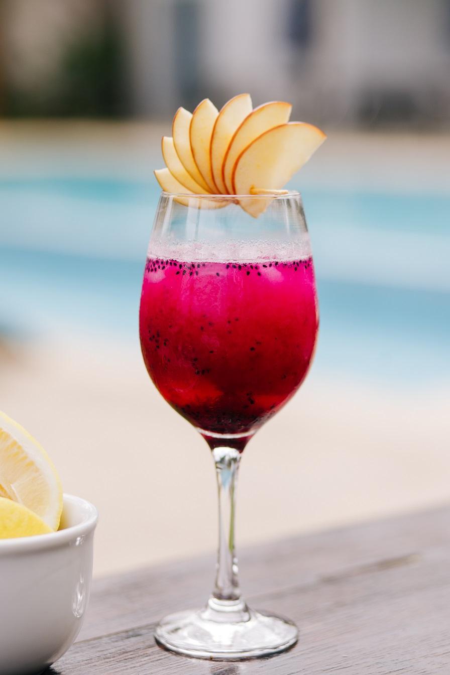 (gin infusionado no hibisco, suco de limão, xarope de romã, tônica, espuma de gengibre)