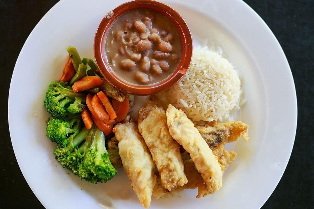 Acompanha arroz e purê de banana da terra Fried fish with rice and smashed banana